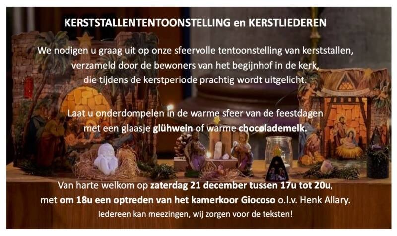 - Zaterdag 21 december 2024 kersthappening met kerststallententoonstelling en koormuziek in de kerk van het Groot Begijnhof te Sint Amandsberg.
